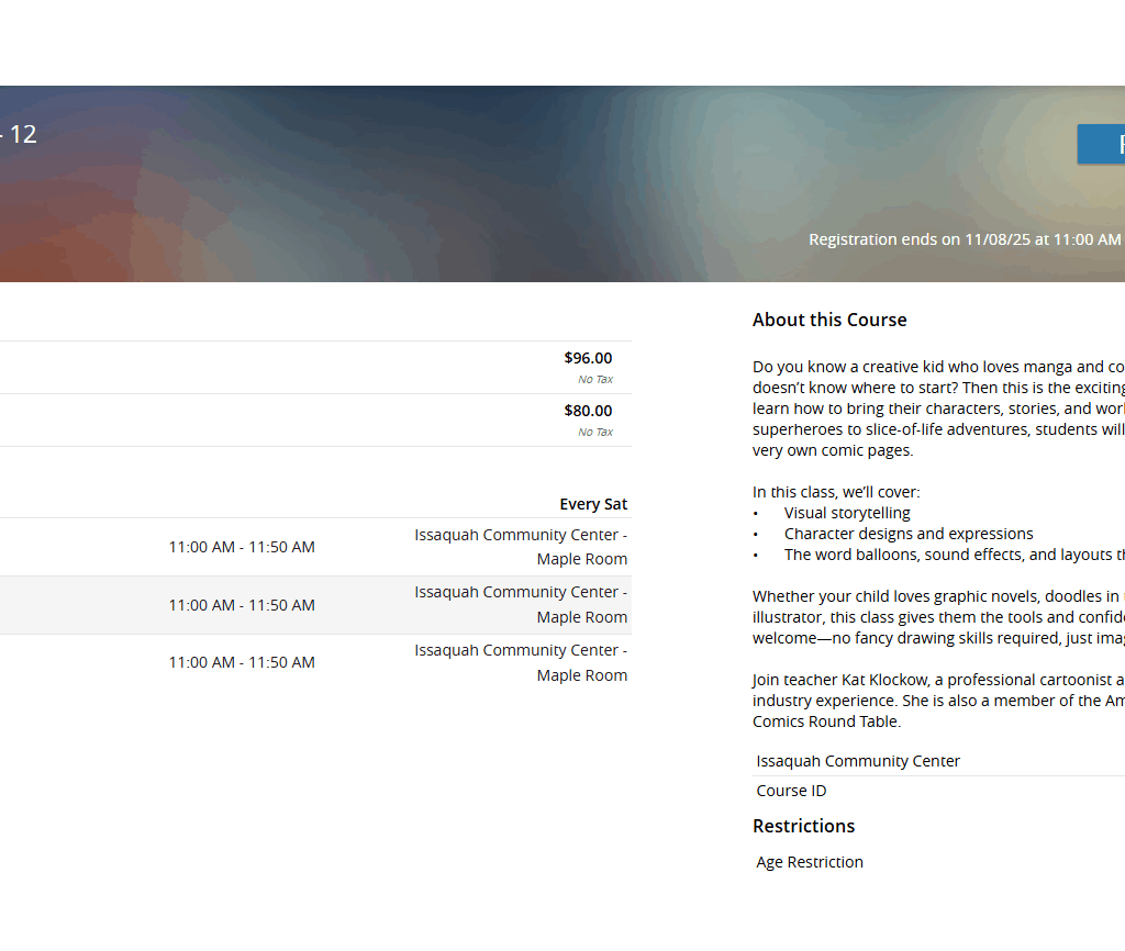 The classes can be a little tricky to find on the programs website, but if you search for keyword “comics” they pop right up.